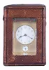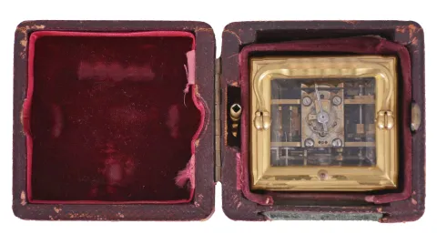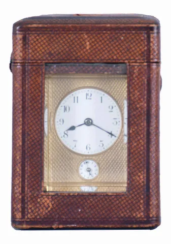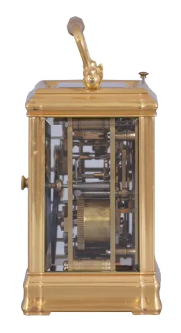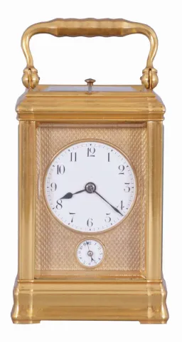 Margaine, Paris, a 3/4 size, Gorge cased hour repeating carriage clock with original outer box, gilt case with beveled glasses, Arabic numeral white enamel dial with gilt, engine turned mask, blued steel hands, 8 day time, strike and alarm movement with lever platform and cut bimetallic balance, repeating the last hour on demand, the back plate with Margaine's mark, serial #19946, with original leather bound travel case, and key lacquer losses resulting in some dulling in affected areas, front glass with small chip at lower left, dial with a few minor scratches, mask good, minute hand replaced, movement with minor staining, running, striking, and repeating correctly, alarm functional, balance rim bent, box with scuffs and minor losses, handle missing, glass replaced and with rough upper edge, blind missing
