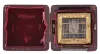 lacquer losses resulting in some dulling in affected areas, front glass with small chip at lower left, dial with a few minor scratches, mask good, minute hand replaced, movement with minor staining, running, striking, and repeating correctly, alarm functional, balance rim bent, box with scuffs and minor losses, handle missing, glass replaced and with rough upper edge, blind missing