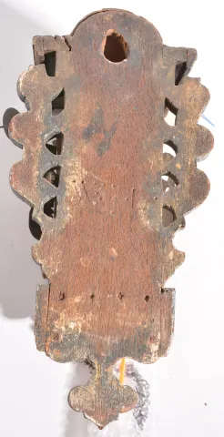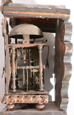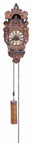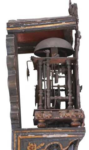Dutch Friesan Stoelklok, MINIATURE, dial chapter ring is only 3 inches. The bracket or stuhl with original gilt mermaids, and lead trim intact. Continuous chain, time and bell strike 30 hour movement. the weight is a replacement. Otherwise this is a neat period clock with lots of potential. In nearly 40 years of selling, this is the first true miniature Stoelklok we have seen outside Holland. Movement is dirty; side dust covers are absent, Note overall height, tip to tip