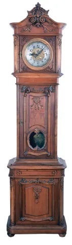 Germany or Austria, standing Viennese regulator, 8 day, time and grand sonnerie strike, three brass weight driven movement in a carved walnut two piece case with engraved silvered dial and engraved pendulum bob