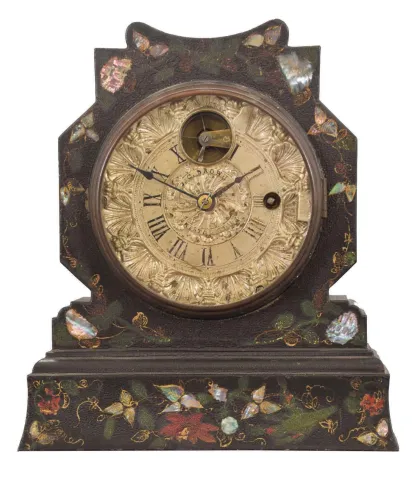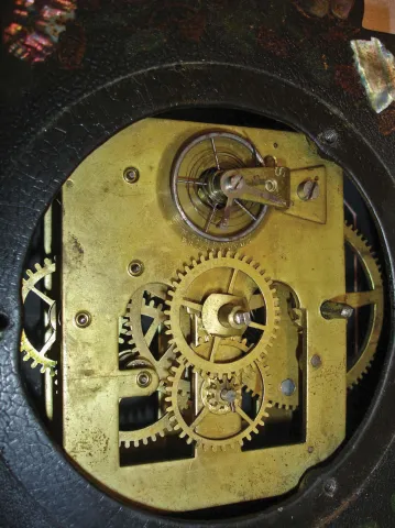 Iron case has its original finish and the pearl inlays are intact.. The cast metal dial is very nice with brown's name stamped in. The hour hand is original but the minute hand is a replacement. The movement is signed. This a scarce miniature clock.