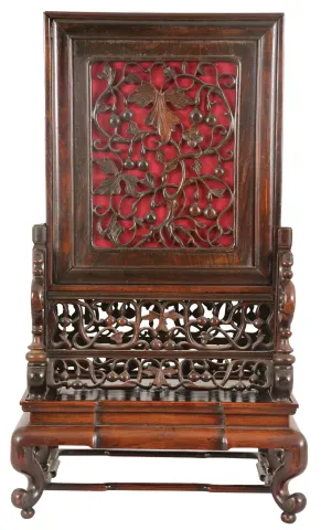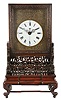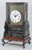 China, a carved camphorwood bracket clock with rotating stand, with pierced and glazed sides, front panel with foliate carving, base with pierced and carved fretwork, Roman numeral white enamel dial with engraved brass surround, blued steel hands, 8 day,
