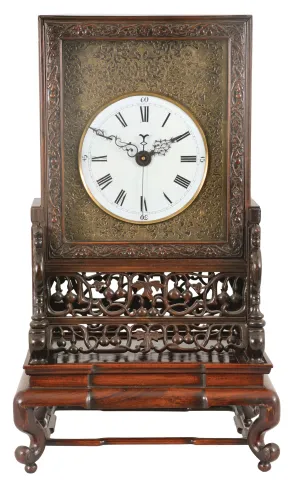 China, a carved camphorwood bracket clock with rotating stand, with pierced and glazed sides, front panel with foliate carving, base with pierced and carved fretwork, Roman numeral white enamel dial with engraved brass surround, blued steel hands, 8 day, time and strike fusee movement with verge escapement, and striking petit sonnerie quarters on two bells composed of 19th and 20th century components, case with repairs and replacements, dial with hairlines, ticks and strikes, rotating base 20th century