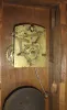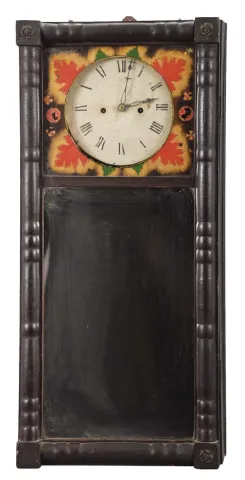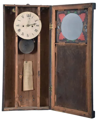 Mahogany case in original finish has some a couple age cracks on the lower left side. One of the embossed brass caps on the lower left block is missing. Original dial glass has some loss to the background. Original mirror. Original painted dial has some wear and stains. At the right angle the signature can still be seen. Original hands. For more information on this maker see "Clockmakers & Clock making in Maine 1770-1900" by Joseph Katra, Jr., Pg 130.