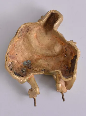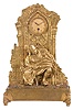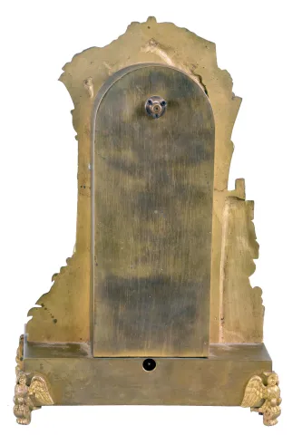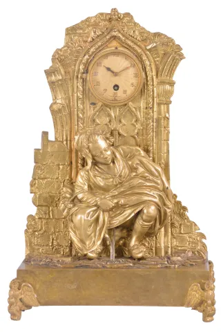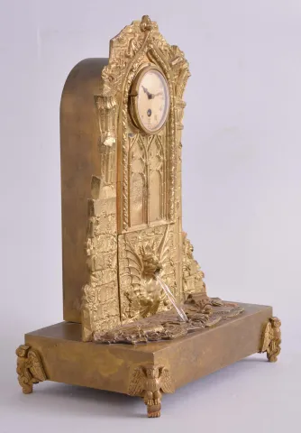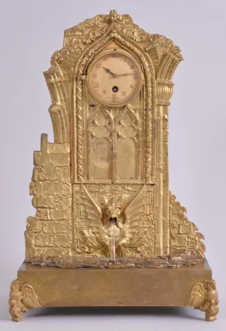 France, an unusual and amusing figural mantel clock, the gilt bronze case with rectangular base on owl form feet, supporting a Gothic ruin with fountain in a rustic landscape, the scene transformed at the observer's will by the placement of the removable, squatting female figure, taking a moment to relieve herself, case back with sheet brass enclosure now with Arabic numeral metal dial and 30 hour timepiece movement case dirty, lacking gilding, minor tarnish and staining, dial and movement replaced, lower movement and glass rod original and functional, and presenting a convincing stream when running. An identical timepiece was included in Antiquorum's Art of Horology in France sale, lot 221, Geneva, November 14, 1993, which retains its original, Roman numeral gilt dial, and time only movement.