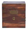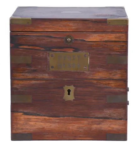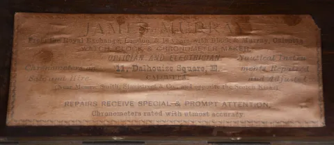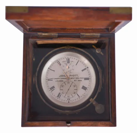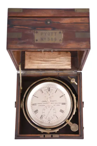 James Pyott, 7 Jamaica Terrace, London, a good two day marine chronometer with original box, 11 jewel, free sprung fusee movement with Earnshaw's spring detent, the Z balance with Poole's auxiliary compensation, blued, helical spring, and diamond endstone, Roman numeral silvered dial with wind indicator, gold spade and poker hands, contained in a lacquered brass bowl with gimbals, and mounted in a rosewood and rosewood veneer box with brass furniture, and brass plaque engraved "Pyott No. 389", the box also with the label of James Murray, Watch Clock, and Chronometer Maker, Calcutta movement dirty, gummy and with much oil residue, plates with minor discoloration, some steel parts with spots of oxide, running, but long overdue for service, dial with minor spotting, hands good, bowl and gimbals with spotting and tarnish, box with significant losses to finish, top with checking and minor veneer lifting, one small section reglued, case hardware tarnished