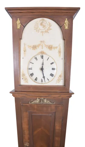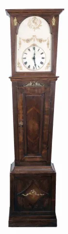 the later case has been refinished with appliques a later addition and the base has water damage on the base with repairs and needs to be resecured. The early period movement is complete and in good condition. Original dial is in very good condition, Hands appear original. All the pipes are present and the pendulum and two weights are period. One lead weight is a replacement.