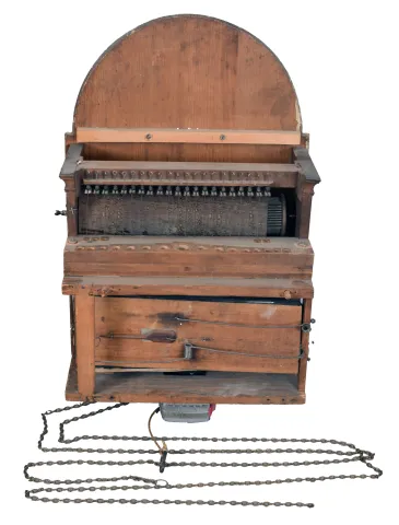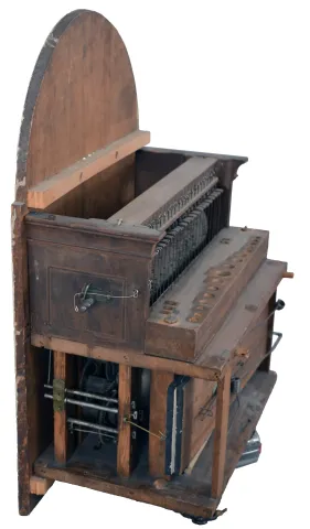 Germany, a Black Forest musical tall clock, 30 hour, time, strike and playing music on 21 pipes, three weight driven movement in a custom made oak case with brass appliques and a painted wooden dial featuring rampant lion in arch. the later case has been refinished with appliques a later addition and the base has water damage on the base with repairs and needs to be resecured. The early period movement is complete and in good condition. Original dial is in very good condition, Hands appear original. All the pipes are present and the pendulum and two weights are period. One lead weight is a replacement.