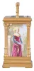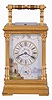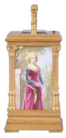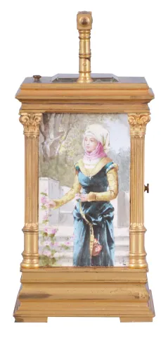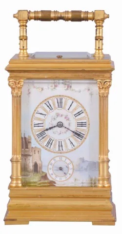 France, for the English market, a fine Pillars style repeating carriage clock with porcelain panels by Lucien Simonnet, the gilt case with stepped, molded base, the corners with fluted columns and Corinthian capitals supporting the molded cornice, the folding handle with turned ornament, case sides set with signed, polychrome enamel scenes depicting colorfully dressed young women in a garden, the Roman numeral dial surrounded by a landscape scene with castle ruins and floral garlands, blued steel distaff hands, 8 day time, strike, and alarm movement with lever platform, and repeating the last hour on demand, serial #2277 original gilding with losses, left side panel with minor chips at upper left, dial panel with chip at upper right, top glass with chips, running, striking, and repeating correctly, alarm functional. Lucien Simonnet (1849- 1926) studied painting under Jules Lefebvre and Gustave Boulanger, at the Ecole des Beaux- Arts, Paris. He later worked painting porcelain at Sevres, during which time the panels for this clock were produced. The painting on the front panel is reminiscent of his oil on canvas "A Castle Ruin at Dusk", sold at Christies, London in 2007.