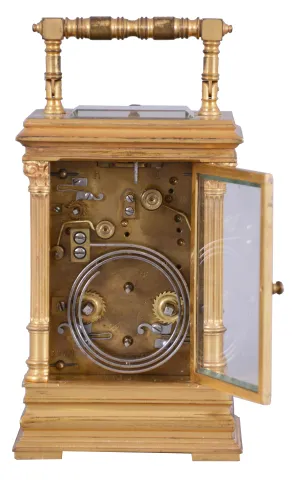 France, for the English market, a fine Pillars style repeating carriage clock with porcelain panels by Lucien Simonnet, the gilt case with stepped, molded base, the corners with fluted columns and Corinthian capitals supporting the molded cornice, the