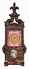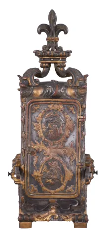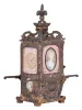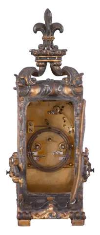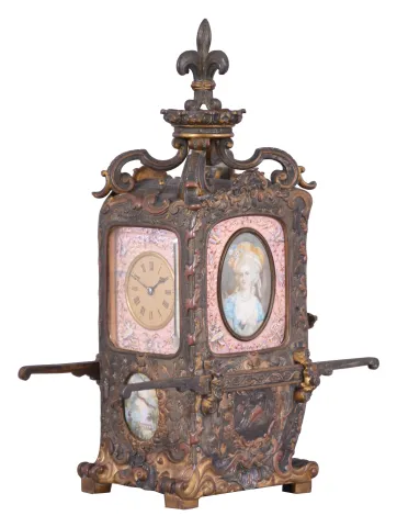 France, hour repeating carriage clock in the form of a sedan chair, the gilt and silvered brass case with faux repousse rococo style ornament, case sides with well executed portraits of a young woman within pink guilloche and polychrome enamel frames, the top with scrolled brackets supporting a fleur de lis finial, Roman numeral gilt metal dial, also with pink guilloche and polychrome enamel surround, the dial above a small, painted garden scene, blued steel hands, 8 day, time and strike movement with lever platform, counting the hours on a gong, and repeating the last hour on demand dirty, silvered surfaces tarnished, losses to silver and gilt finishes, pink enamel with minor hairlines and discoloration, oval garden scene with repaired split, beveled glass with minor chips at lower right, dial and hands good, running, striking and repeating correctly. A very nice example, in unrestored condition.