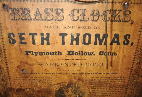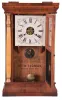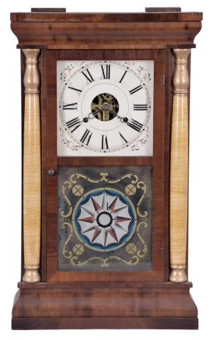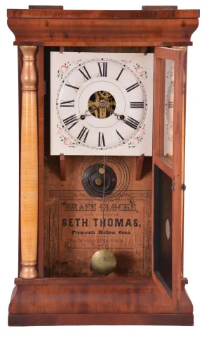 Seth Thomas Clock Co., Plymouth Hollow, Conn., "Column" shelf clock with a weight driven, 30 hour, time and strike movement in a mahogany veneered case with shell columns and gilt caps. The case is in generally good condition with some veneer loss at the top and base of the case. The original painted dial is in very good condition with loss only at the mounting points. The hands are original. The movement is signed. The door glasses are original with the lower glass geometric design having a black backing added later.