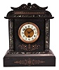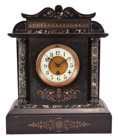 France, mantel clock, 8 day, time only, spring-driven movement in incised black slate case on base with chamfered edges, supporting two full columns of green marble that flank a white porcelain dial with Arabic numerals and blued steel hands, the case topped with a frieze and pediment with matching green marble accents. The black slate case has some of the typical foggy white spots and a handful of small chips on the edges and corners. There is one more substantial loss on the right top side. The beveled glass is fine. The porcelain dial has many hairline cracks on the right side. The hands have some oxidation. The unsigned square movement ticks but was not tested long term. This clock is heavy and fragile if shipping is a consideration.