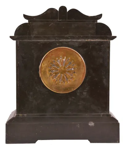 The black slate case has some of the typical foggy white spots and a handful of small chips on the edges and corners. There is one more substantial loss on the right top side. The beveled glass is fine. The porcelain dial has many hairline cracks on the right side. The hands have some oxidation. The unsigned square movement ticks but was not tested long term. This clock is heavy and fragile if shipping is a consideration.