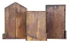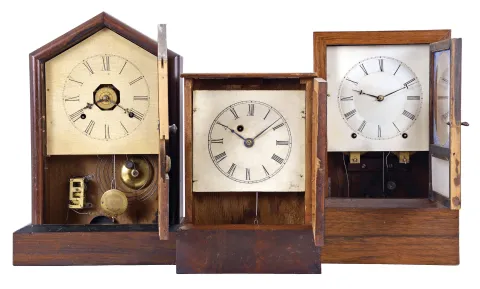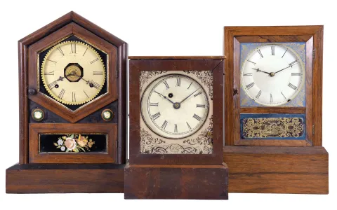 (1) Rosewood veneered case in original finish has some small damage on the top back edge. Painted dial has been replaced. Original tablets. Period hands. Some wear to the gilt door borders. Clean label inside. (2) Mahogany veneered case in original finish has a couple chips on the door and base. Original painted wood dial has minor loss at the winding arbor and the mounting pins. Original style hands for this model. Original decalcomania tablet with Jerome's name. (3) Rosewood veneered case has a couple chips on the base, minor damage on the back edge and veneer repairs on the door. Original dial has been repainted. Original hands and tablets. Partial label inside.