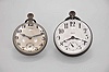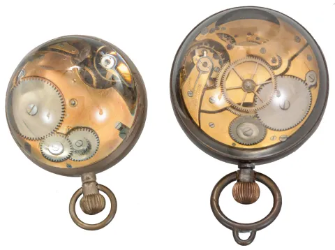 Paperweight clocks- 2 (Two), one marked "Octavia Watch Co.", both with spherical, colorless glass cases and Swiss eight day lever movements, one with Arabic numeral, double sunk white enamel dial, the other with Arabic numeral metal dial, 69mm, 77mm, c1910 smaller clock with tiny flake on front glass, bands and bezels with wear and oxidation, Octavia with good balance, very oily, will tick for a few seconds, the other running, low balance amplitude, both need service