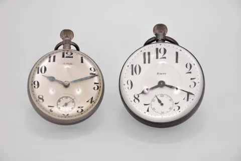 smaller clock with tiny flake on front glass, bands and bezels with wear and oxidation, Octavia with good balance, very oily, will tick for a few seconds, the other running, low balance amplitude, both need service