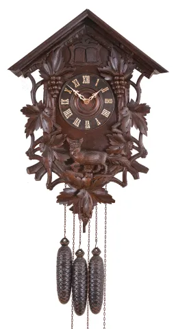 G. G. Berger, Germany, cuckoo and quail wall clock, 30 hour, time and bell strike with animated cuckoo and quail which calls on the quarters, three weight brass movement in a wood case featuring foliage, grapes, and a fox carved below the dial, painted wood cuckoo and quail birds with articulated beaks and wings, the dial with bone hands. Crest is absent. Bellows have been replaced with modern materials. Stem is missing from the end of the leaf on pendulum bob. Red painted steel bells inside of rear door. Weights are modern replacements. The signed movement ticks, strikes, and both the birds perform.