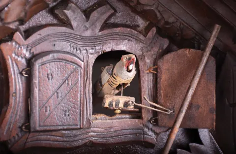 Crest is absent. Bellows have been replaced with modern materials. Stem is missing from the end of the leaf on pendulum bob. Red painted steel bells inside of rear door. Weights are modern replacements. The signed movement ticks, strikes, and both the birds perform.