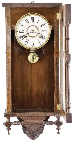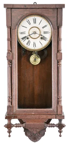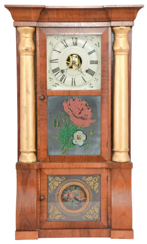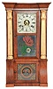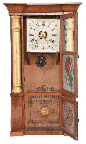 Clocks- 2 (Two): (1) Seth Thomas Clock Co., Plymouth Hollow Hollow, Conn., 8 day, time and strike "Gilt Column" weight brass movement column & cornice shelf clock, c1860 (2) Ansonia Clock Co., New York, "Queen Elizabeth", 8 day, time and strike, spring brass movement wall clock, c1901. (1) Rosewood veneered case in an old finish has some veneer damage at both sides of the base, a small chip on the bottom door and at the upper door door knob. Original painted dial has minor loss at the mounting pins. Original hands. Original center tablet has scattered loss. Original bottom tablet is in nice condition. (2) Oak case in original finish. Top and pendulum are missing. Original paper dial has some surface abrasion and stains. Minute hand may be replaced.