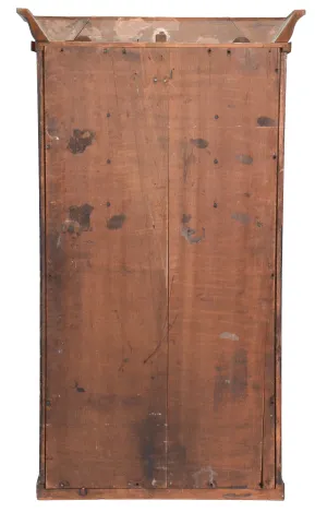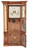 (1) Rosewood veneered case in an old finish has some veneer damage at both sides of the base, a small chip on the bottom door and at the upper door door knob. Original painted dial has minor loss at the mounting pins. Original hands. Original center tablet has scattered loss. Original bottom tablet is in nice condition. (2) Oak case in original finish. Top and pendulum are missing. Original paper dial has some surface abrasion and stains. Minute hand may be replaced.