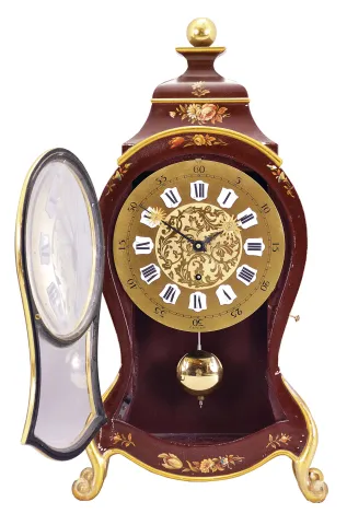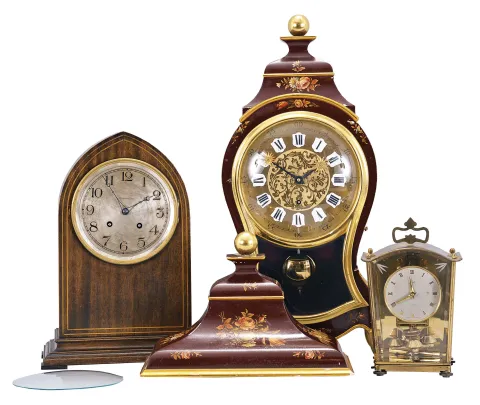 Clocks- 3 (Three) Mantel: (1) Zenith, Le Locle, Switzerland, reproduction Neuchatel bracket clock, 8 day, time and strike, tandem spring driven movement in a floral decorated painted wood case. (2) Waltham Clock Co., Waltham, Mass., lancet mantel clock, 8 day, time and strike, spring driven balance wheel movement in a walnut case with silvered dial reading "J.E. Caldwell & Co.". (3) Shatz, Germany, 400 day or anniversary clock, time only, spring driven movement with torsion pendulum in a brass and glass case. (1) Case has nicks to paint on the edges. Gilding has worn off of legs in spots. (2) Case with an original finish. Silvered dial somewhat darkened with tarnish. Glass is loose. (3) Lacquer protecting brass has started to turn brown in places. Dimensions are for the Swiss bracket clock (1) .