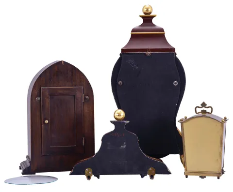 (1) Case has nicks to paint on the edges. Gilding has worn off of legs in spots. (2) Case with an original finish. Silvered dial somewhat darkened with tarnish. Glass is loose. (3) Lacquer protecting brass has started to turn brown in places. Dimensions are for the Swiss bracket clock (1) .