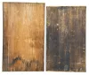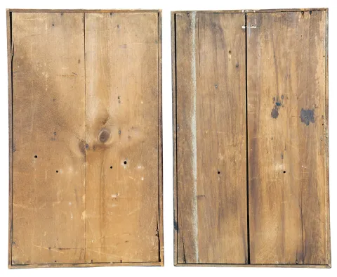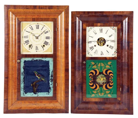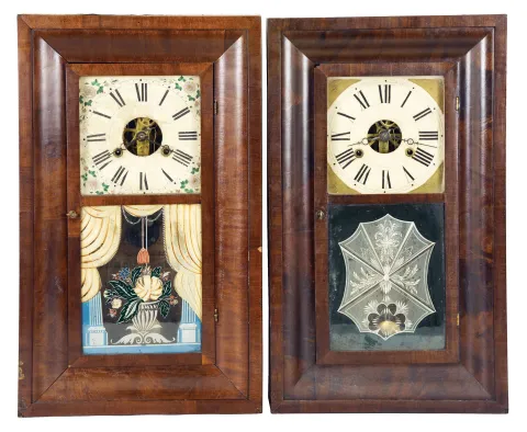 (1) Mahogany and birdseye maple case in an old finish in nice condition has a couple small repairs on the bottom outer band. Original wooden dial is in nice condition for its age. Original tablet has some scattered loss to the background. Original hands. Dark label inside. (2) Mahogany veneered case in an old finish has some veneer chips on the outer band and on the right side bottom edge,. Original painted dial has some wear to the numbers. Original hands and tablet. Clean label inside. (3) Mahogany veneered case in an old finish has some loss at the bottom corners of the door, at the door knob and the bottom left corner of the outer band. Original painted dial has some loss at the mounting pins and at the winding arbors. Original tablet. Hands are modern replacements. Clean label inside. (4) Mahogany veneered case in an old finish has chips on the corners of the outer band. Original dial has been repainted. Period hands. Tablet is a replacement. Clean label inside. (5) Mahogany veneered case has some loss at the bottom corners of the outer band and a door corner. Original painted dial has some loss at the mounting pins. Original tablet and hands. Clean label inside.