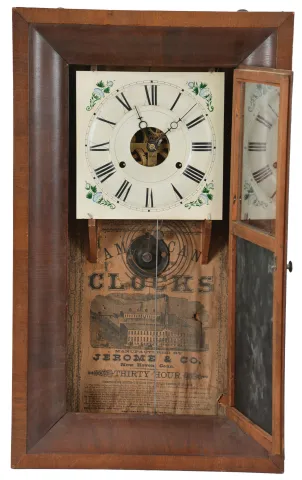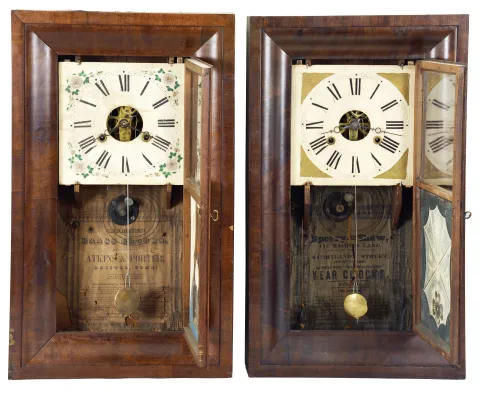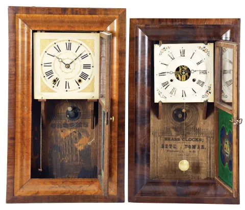 Clocks- 5 (Five): (1) Smith & Brothers, New York, 30 hour, time and strike, weight wood movement OG shelf clock, c1841 (2) Atkins & Porter, Bristol, Conn., 30 hour, time and strike, weight brass movement OG shelf clock, c1845 (3) Seth Thomas Clock Co.,