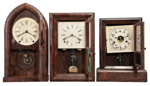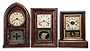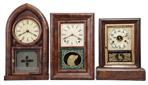 Clocks- 3 (Three): (1) Brewster and Ingrahams, Bristol, Conn., Round Gothic shelf clock with a spring (brass) driven, 8 day, time and strike movement in a mahogany veneered case, c1848. (2) Seth Thomas Clock Co., Thomaston, Conn., "Round Band" shelf clock