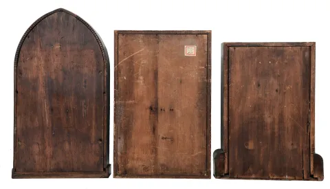 (1) The case has been refinished and has some veneer issues. The dial has been repainted. The hands are original. The upper door glass is original, but the lower glass is replaced. (2) The case has original finish and multiple small areas of veneer loss. The dial has likely been repainted. The hands are original. The door glasses are original. (3) The case has its original finish with some veneer issues on the base. The dial has been poorly repainted. The hands are replaced. The door glasses are original. NOTE: The dimensions are for clock number one (1) ;
