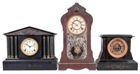 Clocks- 3 (Three) Ansonia Mantel: (1) Ansonia Clock Co., New York, "Grenoble " mantel clock, 8 day, time and strike, spring-driven movement in a black enameled iron case, c1914; (2) Ansonia Clock Co., New York, "Servia", mantel clock, 8 day, time and strike, spring-driven movement with visible escapement in a black enameled iron case, c1886; (3) Ansonia Clock Co., New York, "Plebeian" walnut mantel clock, 8 day, time and strike, spring-driven movement with nice pendulum and tablet, c1880. Clocks are in generally good condition with some blemishes and small losses of the finish. All three tick, but were not tested long term. Sold "as is".