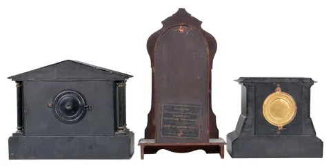 Clocks are in generally good condition with some blemishes and small losses of the finish. All three tick, but were not tested long term. Sold "as is".