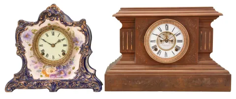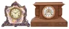 Clocks- 4 (Four) Time and Strike Mantel: (1) Seth Thomas Clock Co., tambour clock, 8 day, time and strike with Westminster chime, spring-driven No. 124 movement in a mahogaNew York case with silvered dial. (2) GermaNew York, tambour clock, 8 day, time and strike, spring-driven movement in an oak case with silvered chapter ring. (3) Ansonia Clock Co., New York, "Marbleite No. 2" mantel clock, 8 day, time and strike, spring-driven movement with visible escapement in a hard rubber case meant to simulate wood. (4) Ansonia Clock Co., New York, "La Lorne" mantel clock, 8 day, time and strike, spring-driven movement in a blue Royal Bonn porcelain case with floral motif. (1) Case and dial in good condition. (2) Case with some small nicks to the edges. Silvered dial worn at the 9 and 12 o'clock positions. (3) Clock may have been painted black originally. If so, the black is long gone. Very nice signed dial, steel pallet jewels. Original hands. (4) Porcelain case in very nice condition. Cream colored porcelain dial is excellent. Original hands. A bit of glue residue around beveled glass. Dimensions are for the porcelain clock. Sold "as is".