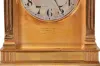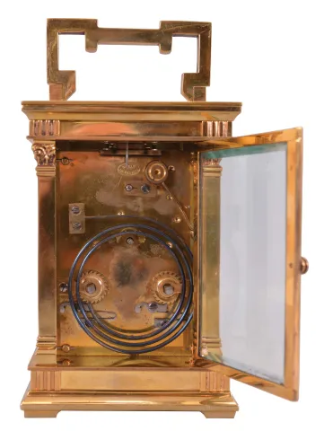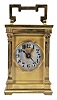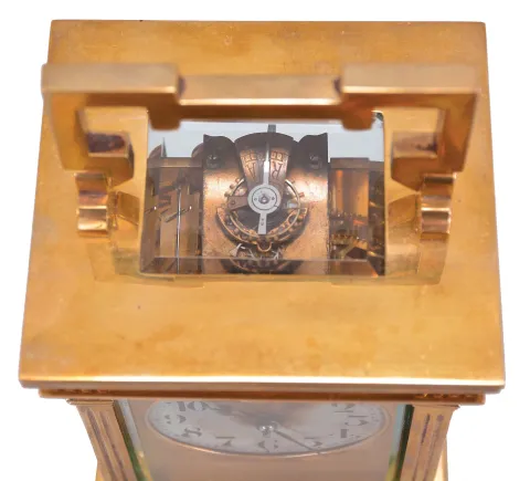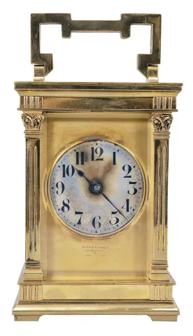 France, carriage clock, 8 day, time and strike counting the hours on a gong, spring driven movement with lever platform in an Anglaise case with fluted pilasters and and set with beveled glasses, gilt mask reading in part "Mappin & Webb Ltd. / 172 Regent St." surrounding a silvered dial with Arabic numerals, blued steel hands. polished brass case is bright and in very good condition. Two of the beveled glasses have very small chips in the corners. The upper portion of the silvered dial is very dark where the steel hands rested for a long time. Unsigned movement ticks and strikes.