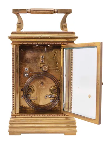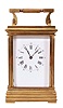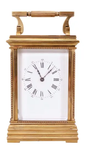 France, carriage clock, 8 day, time and strike counting the hours on a gong, spring driven movement with lever platform in an Anglaise case with stepped and molded base, edge beading and glazed on five sides with beveled glass, white enamel dial with