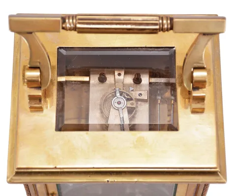 France, carriage clock, 8 day, time and strike counting the hours on a gong, spring driven movement with lever platform in an Anglaise case with stepped and molded base, edge beading and glazed on five sides with beveled glass, white enamel dial with Roman numerals for the hours and Arabic numerals for the minutes, blued steel distaff style hands. brass case has a bright polish with some small dents on the top of the back side. Three of the five beveled glasses have small, visible chips at the corners. The dial and hands are very good. The back plate of the unsigned movement is covered in a film of oil and could use cleaning. Ticks briskly and strikes.