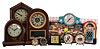 Clocks- 9 (Nine): (1) Seth Thomas Clock Co., Thomaston, Conn., "Prospect No. 17" shelf clock with a spring driven, 8 day, time and half hour strike movement in a mahogany veneered case, c1917. (2) New Haven Clock Co., New Haven, Conn., "Tuscan" shelf clock with a spring driven, 8 day, time and strike movement in a rosewood veneered case, c1880. (3) Seth Thomas Clock Co., Thomaston, Conn., unidentified model shelf clock with a spring driven, 8 day, time, strike and alarm movement in a rosewood veneered case, c1870. (4) New Haven Clock Co., New Haven, Conn Diner novelty clock with a battery operated quartz movement in a plastic case., c1955 (5) Gilbert Clock Co., Winsted, Conn., "Aussie's" alarm clock with a 30 hour, time and alarm movement in a metal case, c1930. (6) Lux/Robert Shaw alarm clock, c1950. (7) Mickey Mouse alarm clock c1960. (8) Western Clock Co., LaSalle, Illinois, "Baby Ben" alarm clock in a nickel plated case, c1922. (9) Western Clock Co., LaSalle, Illinois, "Baby Ben Deluxe" alarm clock in a nickel plated case (1) The case has original finish. The painted dial is in good condition. The hour hand is correct. The minute hand may be replaced, The movement is signed. (2) The case is in very nice condition with original finish. The original painted dial is showing loss but it is concealed by the upper door glass. The hands are period and may be original. Both door glasses are original. (3) The case is in excellent condition with some original finish. The original painted dial is in good condition with some minor in-painting. The ST hands have age. The door glass is original. The door mirror may be a later replacement. (4) The case is still in good condition with some fading of the colors. (5) The case has some paint loss. The dial and hands are original. (6) The case, dial and hands are all in good original condition. (7) The case, dial and hands are all in excellent condition. (8) The case, hands and dial are in excellent condition. (9) The case, dial and hands are in good condition. The hour hand has come detached and needs attention.