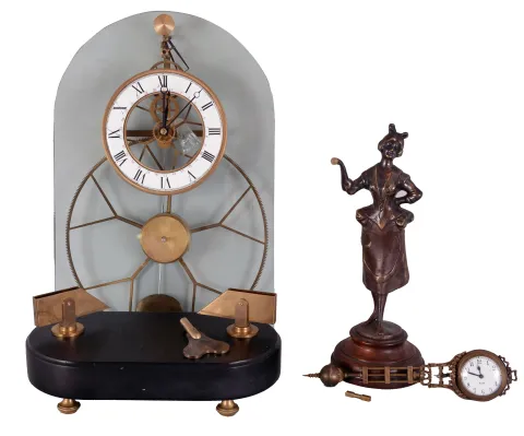 Clocks- 2 (Two) Reproduction: Chinese glass plate skeleton clock and a reproduction Diana Swinger. new, as found, sold "as is". Skeleton has no dome, glass and base separated and need new screws.