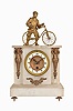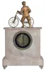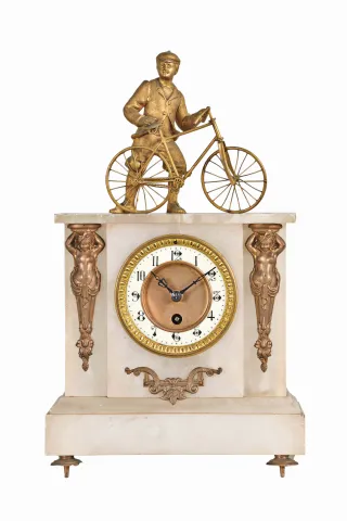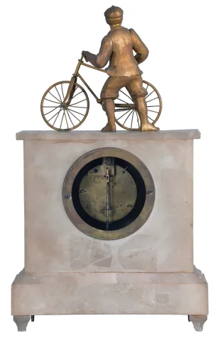 France, 8 day, time spring brass movement alabaster mantel timepiece with statue of a man and his bicycle.