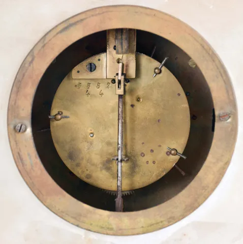 The top alabaster piece has a crack across the center and hairline at the front dial panel. Original porcelain dial is fine. Original hands.