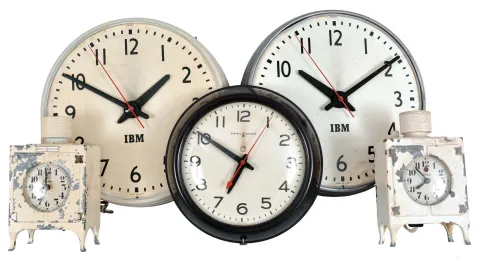 Clocks- 19 (Nineteen) Electric Clocks: assortment of electric clocks by makers including Mastercrafters Kalex, Acroprint, Telechron, Sangamo, IBM, General Electric, Jefferson, Hamilton, Chelsea, Stromberg, Waterbury, and Waltham.