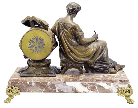 French, Marti & Cie, 8 day, time and strike, spring brass movement figural mantel clock. The marble base is in nice condition with no discernible roughness on the edges. Cast figure looks to retail most of its original finish except for a small spot on the face and hand where it looks someone used a file and removed the finish. Original porcelain dial has some very tiny chips at the winding holes. Original hands. Movement is signed.