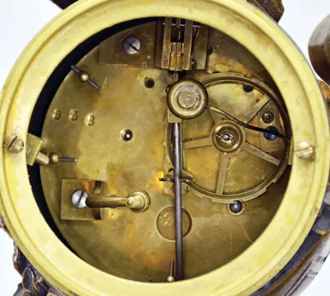 The marble base is in nice condition with no discernible roughness on the edges. Cast figure looks to retail most of its original finish except for a small spot on the face and hand where it looks someone used a file and removed the finish. Original porcelain dial has some very tiny chips at the winding holes. Original hands. Movement is signed.