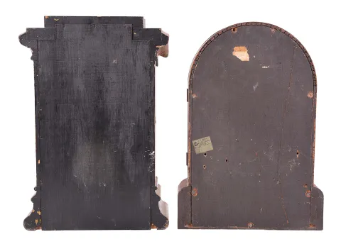 Clocks- 2 (Two): (1) Seth Thomas Clock Co., Thomaston, Conn., "Tudor No. 1" shelf clock with a spring driven, 8 day, time, strike and alarm movement (Lyre) in a rosewood veneered case, c1875. (2) Seth Thomas Clock Co., Thomaston, Conn., "Arch Top" shelf clock with a spring driven, 8 day, time, strike and alarm movement in an oak and ash case, c1880. (1) The case is in good condition with some veneer loss on the left side if the bezel and the left and top side of the door. There is some finish left on the case. The painted dial is original with some poor restoration work. The hands are original "ST" hands. The movement is signed. (2) The case is in good condition with very minimal veneer loss. The original dial pan has been repainted. The "ST" hands are new. The movement is signed. ***NOTE*** The dimensions are for clock number (1) .