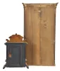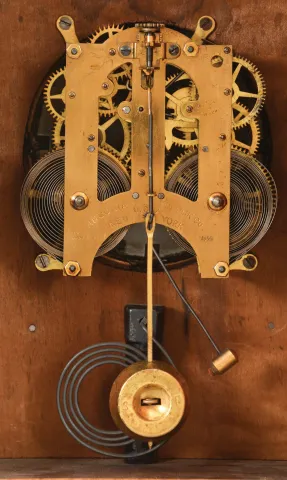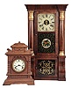 (1) Rosewood veneered case in nice condition with some small veneer loss on the front edge of the top cornice. Original bottom tablet looks to have the gold design repaired with gold paint. Original middle tablet. Original painted dial has a poor paint repair at 7:30, some minor flaking and some staining. Original hands. The top and base on the columns are now gold painted. Clean label inside. (2) Oak case in a partially worn original finish. Original porcelain dial is perfect. Original hands. Movement is signed. Clean label inside.