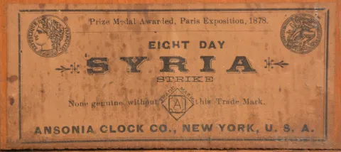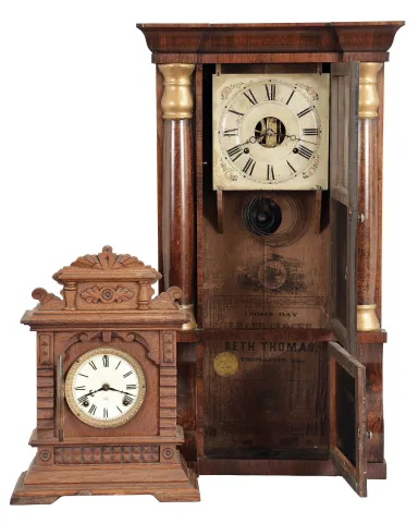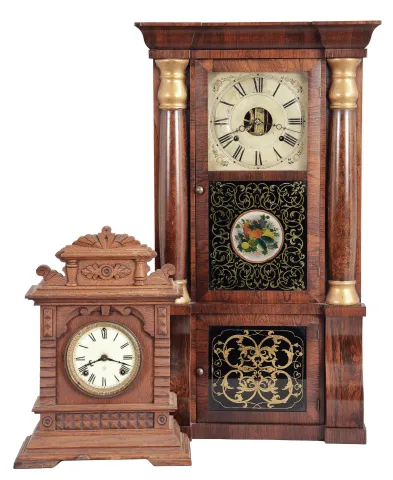 Clocks- 2 (Two): (1) Seth Thomas, Thomaston, Conn., 8 day, time and strike, weight column and cornice shelf clock, c1870 (2) Ansonia Clock Co., New York, "Syria", 8 day, time and strike, spring brass movement cabinet model mantel clock, c1894 (1) Rosewood veneered case in nice condition with some small veneer loss on the front edge of the top cornice. Original bottom tablet looks to have the gold design repaired with gold paint. Original middle tablet. Original painted dial has a poor paint repair at 7:30, some minor flaking and some staining. Original hands. The top and base on the columns are now gold painted. Clean label inside. (2) Oak case in a partially worn original finish. Original porcelain dial is perfect. Original hands. Movement is signed. Clean label inside.