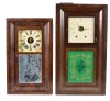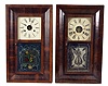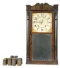 Clocks- 7 (Seven) Weight-driven American mantel: an assortment of four 30 hour ogees, one 8-day double door ogee and one 8-day double door OOG, and one 30-hour wooden movement in stenciled column & splat wooden case. Lot includes 5 pairs of 30 hour