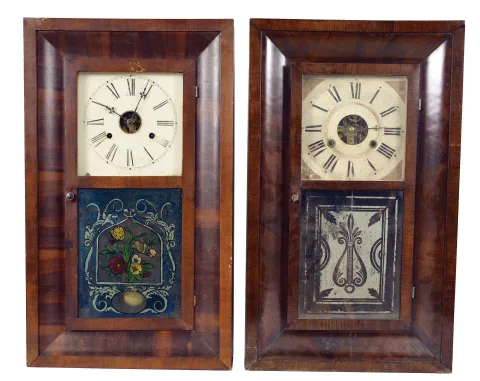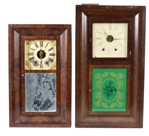 Most have better than average mahogany veneered cases. Several have original tablets. One 8-day dial is repainted or replaced. Other dials may have loss or fading. Sold "as is".