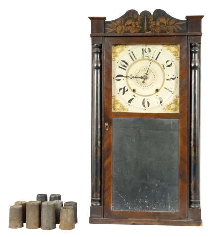 Clocks- 7 (Seven) Weight-driven American mantel: an assortment of four 30 hour ogees, one 8-day double door ogee and one 8-day double door OOG, and one 30-hour wooden movement in stenciled column & splat wooden case. Lot includes 5 pairs of 30 hour weights. Makers include New Haven, George Marsh, Waterbury, Jonathan Frost, E. N. Welch, George Vaughan, and William S. Johnson. Most have better than average mahogany veneered cases. Several have original tablets. One 8-day dial is repainted or replaced. Other dials may have loss or fading. Sold "as is".